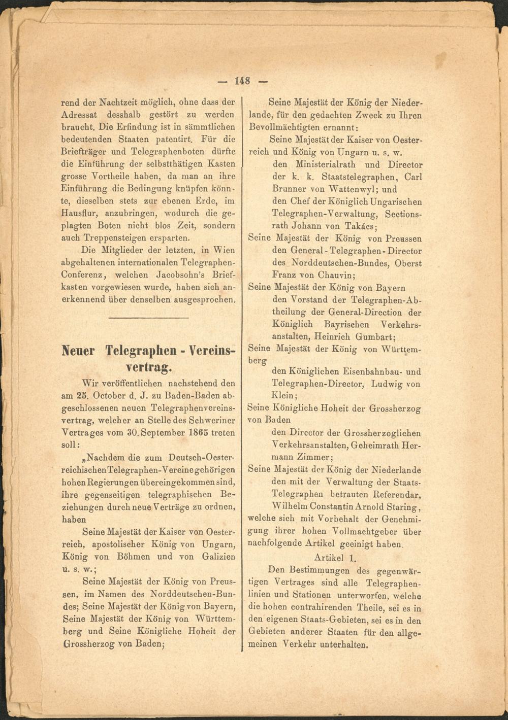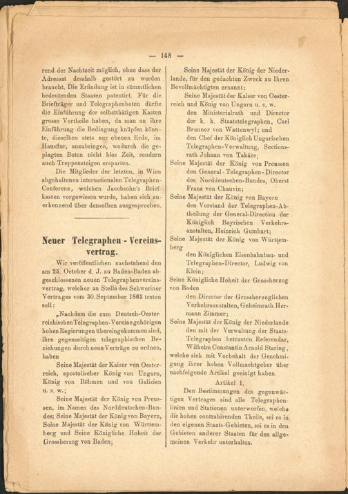 Wir veröffentlichen nachstehend den am 25. October d. J. zu Baden-Baden abgeschlossenen neuen Telegraphenvereinsvertrag, welcher an Stelle des Schweriner Vertrages vom 30.September 1865 treten soll: