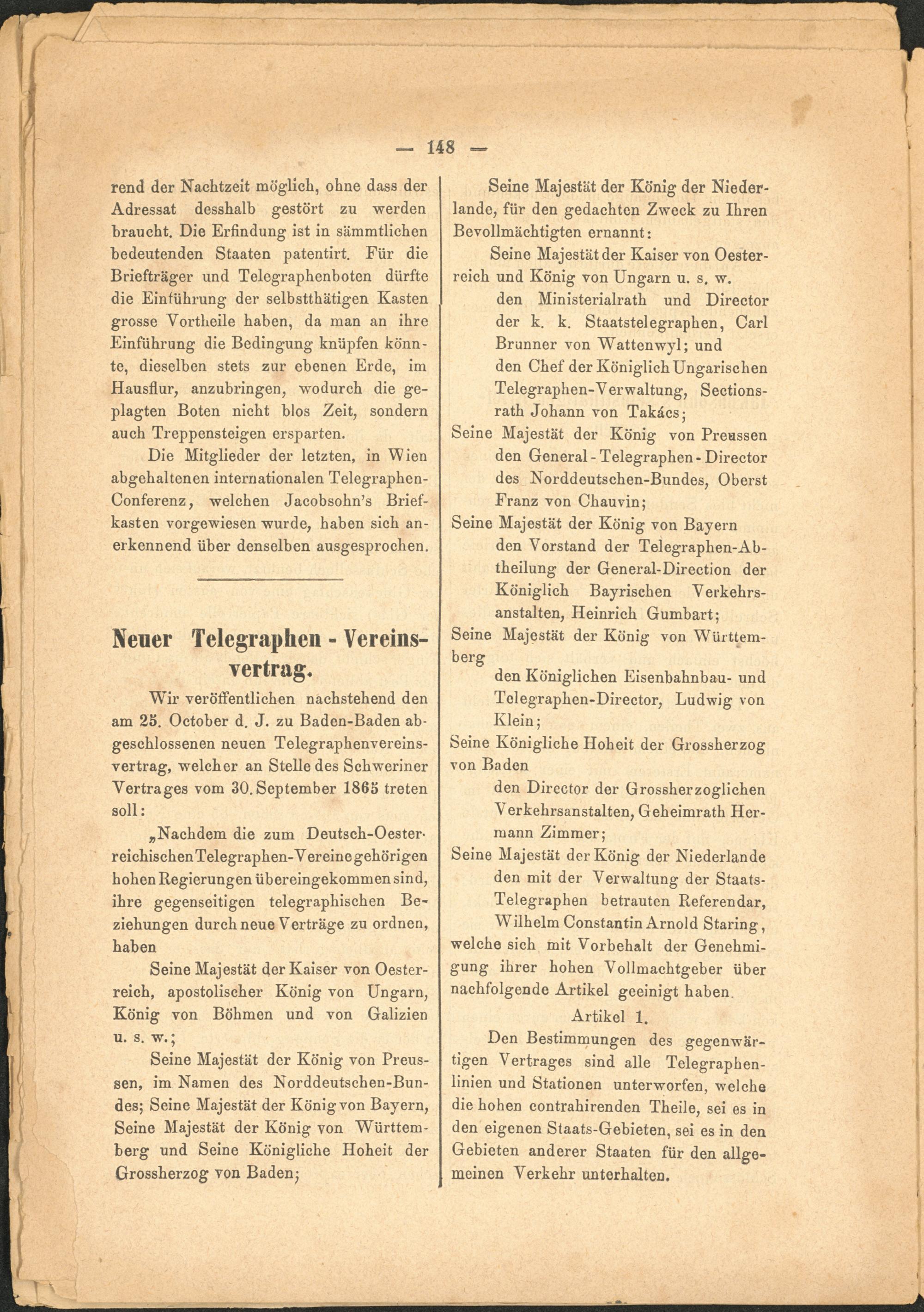 „Nachdem die zum Deutsch-Oester- reichischen Telegraphen-V ereine gehörigen hohen Regierungen übereingekommen sind, ihre gegenseitigen telegraphischen Beziehungen durch neue Vertrage zu ordnen, haben