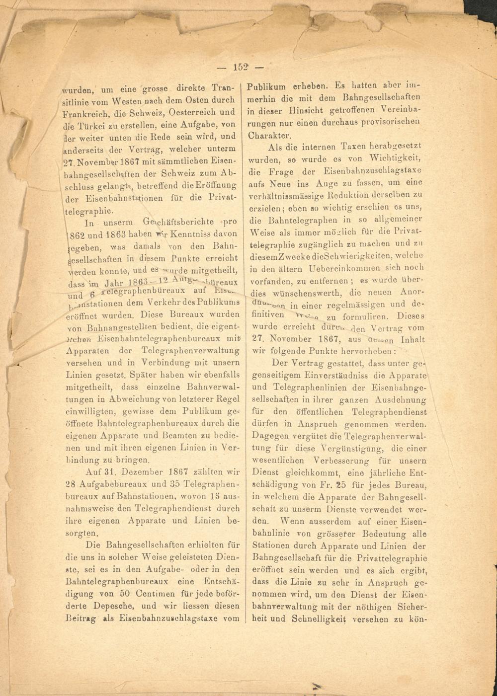 wurden, um eine grosse direkte Tran­sitlinie vom Westen nach dem Osten durch Frankreich, die Schweiz, Oesterreich und die Türkei zu erstellen, eine Aufgabe, von der weiter unten die Rede sein wird, und anderseits der Vertrag, welcher unterm 27. November 1867 mit sämmtlichen Eisen- bahngescllscliaften der Schweiz zum Ab­schluss gelangt^ betreffend die Eröffnung der Eisenbahnstationen für die Privat­telegraphie.