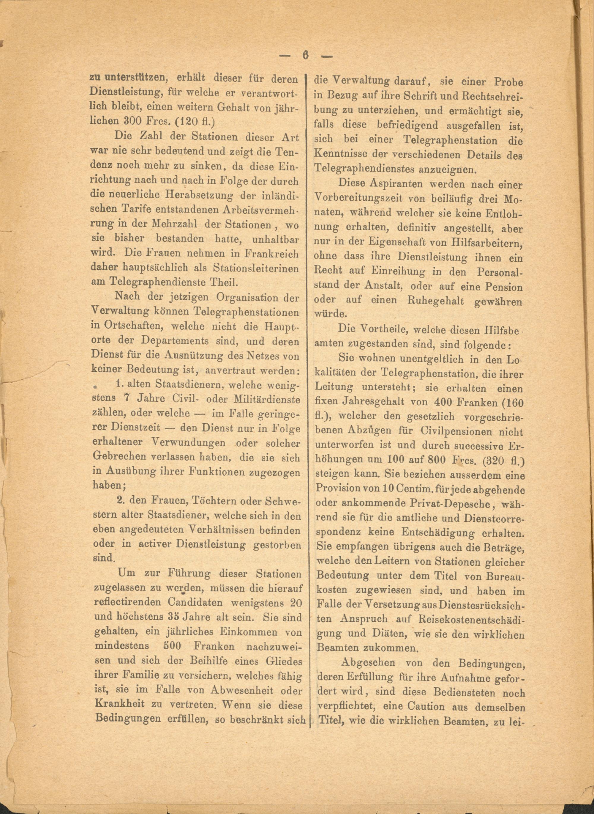Sie wohnen unentgeltlich in den Lo kalitäten der Telegraphenstation, die ihrer Leitung untersteht; sie erhalten einen fixen Jahresgehalt von 400 Franken (160 fl.), welcher den gesetzlich vorgeschriebenen Abzügen für Civilpensionen nicht unterworfen ist und durch successive Erhöhungen um 100 auf 800 Frcs. (320 fl.) steigen kann. Sie beziehen ausserdem eine Provision von 10 Centim. für jede abgehende oder ankommende Privat-Depesche, während sie für die amtliche und Dienstcorre- spondenz keine Entschädigung erhalten. Sie empfangen übrigens auch die Beträge, welche den Leitern von Stationen gleicher Bedeutung unter dem Titel von Bureaukosten zugewiesen sind, und haben im Falle der Versetzung aus Dienstesrücksichten Anspruch auf Reisekostenentschädigung und Diäten, wie sie den wirklichen Beamten zukommen.