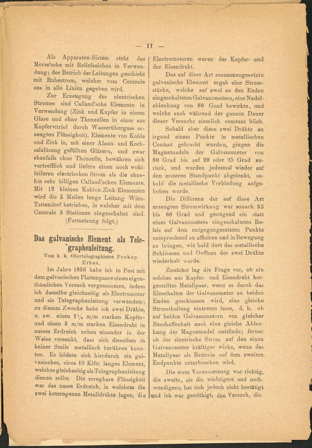 Zur Erzeugung des electrischen Stromes sind Callaudsche Elemente in Verwendung (Zink und Kupfer in einem Glase und ohne Thonzellen in einer aus Kupfervitriol durch Wasserüberguss er­zeugten Flüssigkeit). Elemente von Kohle und Zink in, mit einer Alaun- und Koch­salzlösung gefüllten Gläsern, und zwar ebenfalls ohne Thonzelle, bewähren sich vortrefflich und liefern einen noch wohl­feileren electrischen Strom als die ohne­hin sehr billigen Callaudschen Elemente. Mit 12 kleinen Kohlen-Zink-Elementen wird die 5 Meilen lange Leitung Wien- Tattendorf betrieben, in welcher mit dem Centrale 3 Stationen eingeschaltet sind.