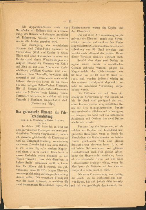 Im Jahre 1836 habe ich in Pest mit dem galvanischen Plattenpaare einen eigen- thümlichen Versuch vorgenommen, indem ich dasselbe gleichzeitig als Electromotor und als Telegraphenleitung verwendete; zu diesem Zwecke habe ich zwei Drähte, u. zw. einen 1 i j 2 m/m starken Kupfer- und einen 3 m/m starken Eisendraht in nasses Erdreich neben einander in der Weise versenkt, dass sich dieselben in keiner Stelle metallisch berühren konn­ten. Es bildete sich hierdurch ein gal­vanisches, circa 10 Klftr. langes Element, welches gleichzeitig als Telegraphenleitung dienen sollte. Die erregbare Flüssigkeit war das nasse Erdreich, in welchem die zwei heterogenen Metalldrähte lagen, die