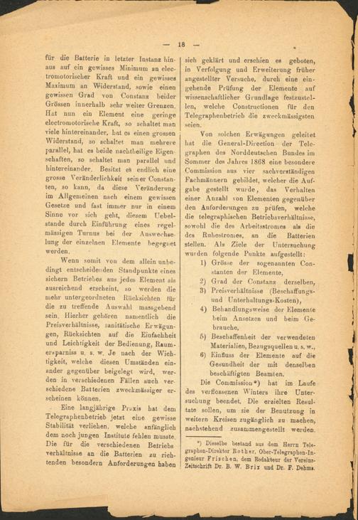 Von solchen Erwägungen geleitet bat die General-Direction der Telegraphen des Norddeutschen Bundes im Sommer des Jahres 1868 eine besondere Commission aus vier sachverständigen Fachmännern gebildet, welcher die Aufgabe gestellt wurde, das Verhalten einer Anzahl von Elementen gegenüber den Anforderungen zu prüfen, welche die telegraphischen Betriebsverhaltnis.se, sowohl die des Arbeitsstromes als die des Ruhestromes, an die Batterien stellen. Als Ziele der Untersuchung wurden folgende Punkte aufgestellt: