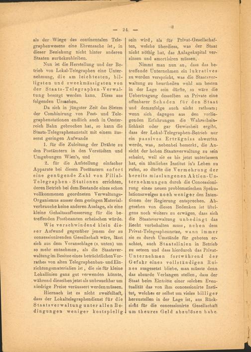 Nun ist die Herstellung und der Betrieb von Lokal-Telegraphen eine Unternehmung, die am leichtesten, billigsten und zweckmässigsten von der Staats-Telegraphen-Verwaltung besorgt werden kann. Diess aus folgenden Ursachen.