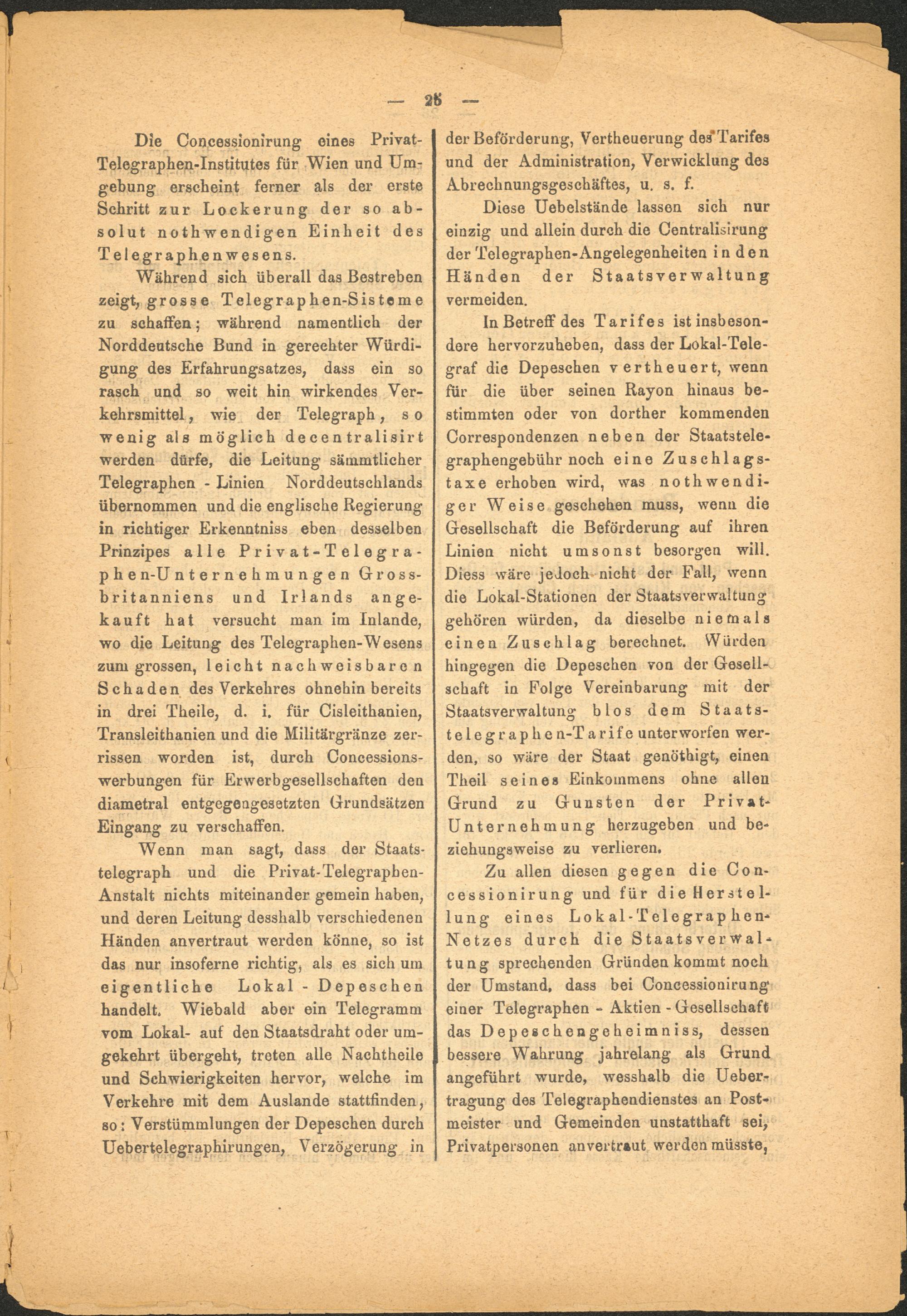Wenn man sagt, dass der Staatstelegraph und die Privat-Telegrapben- Anstalt nichts miteinander gemein haben, und deren Leitung desshalb verschiedenen Händen anvertraut werden könne, so ist das nur insoferne richtig, als es sich um eigentliche Lokal - Depeschen handelt. Wiebald aber ein Telegramm vom Lokal- auf den Staatsdraht oder umgekehrt übergeht, treten alle Nachtheile und Schwierigkeiten hervor, welche im Verkehre mit dem Auslande stattfinden, so: Verstümmlungen der Depeschen durch Uebertelegraphirungen, Verzögerung in