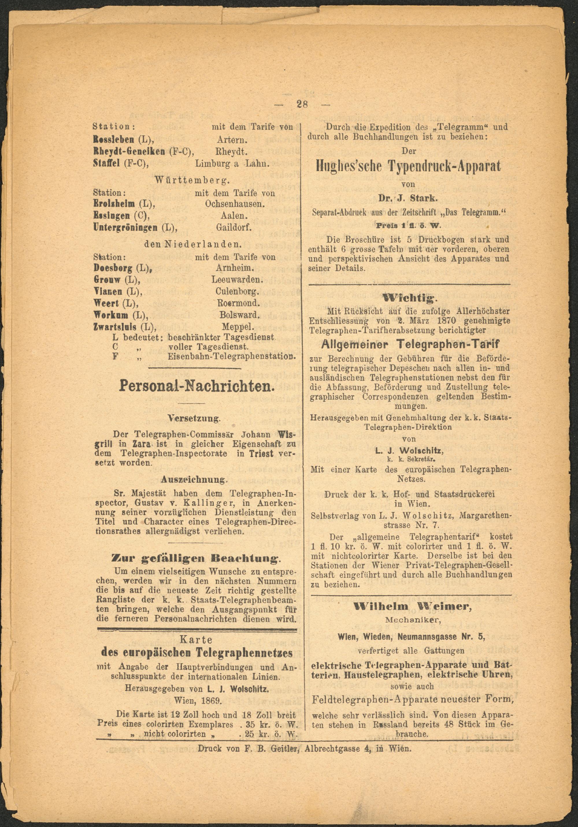 Herausgegeben mit Genehmhaltung der k. k. Staats- Telegraphen-Direktion von
