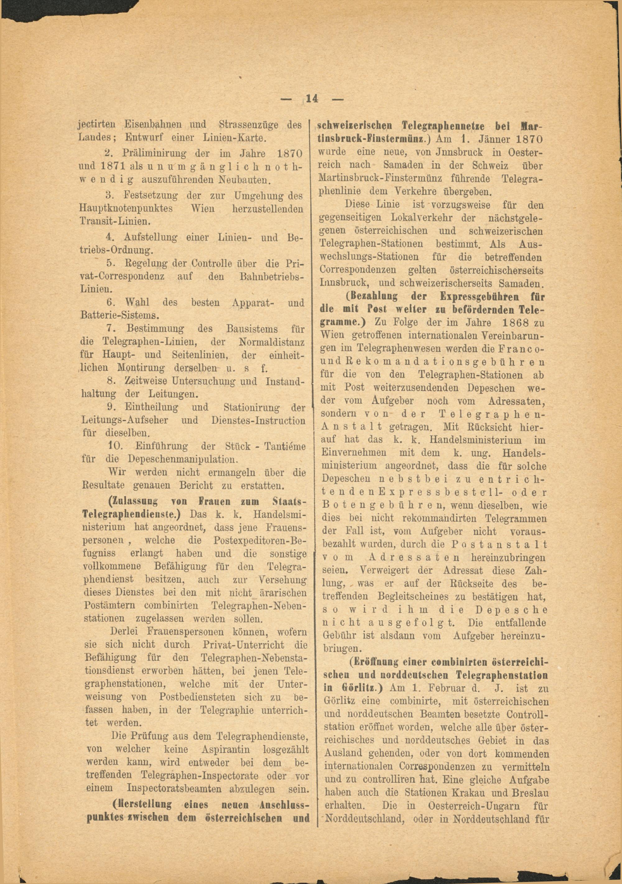 Diese Linie ist vorzugsweise für den gegenseitigen Lokal verkehr der nächstgelegenen österreichischen und schweizerischen Telegraphen-Stationen bestimmt. Als Auswechslungs-Stationen für die betreffenden Correspondenzen gelten österreichischerseits Innsbruck, und schweizerischerseits Samaden.