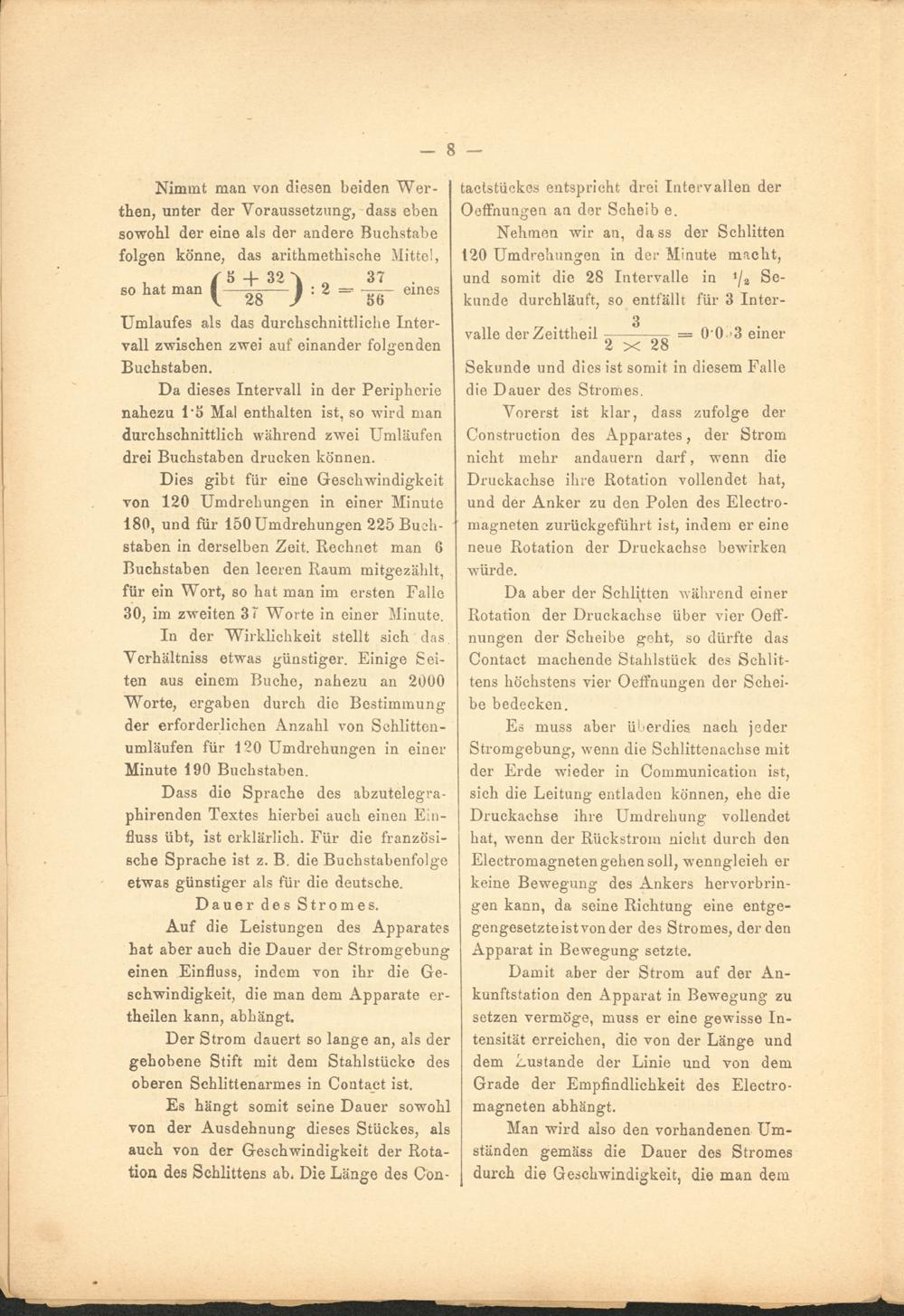 In der Wirklichkeit stellt sich das Verhältniss etwas günstiger. Einige Seiten aus einem Buche, nahezu an 2000 Worte, ergaben durch die Bestimmung der erforderlichen Anzahl von Schlittenumläufen für 120 Umdrehungen in einer Minute 190 Buchstaben.