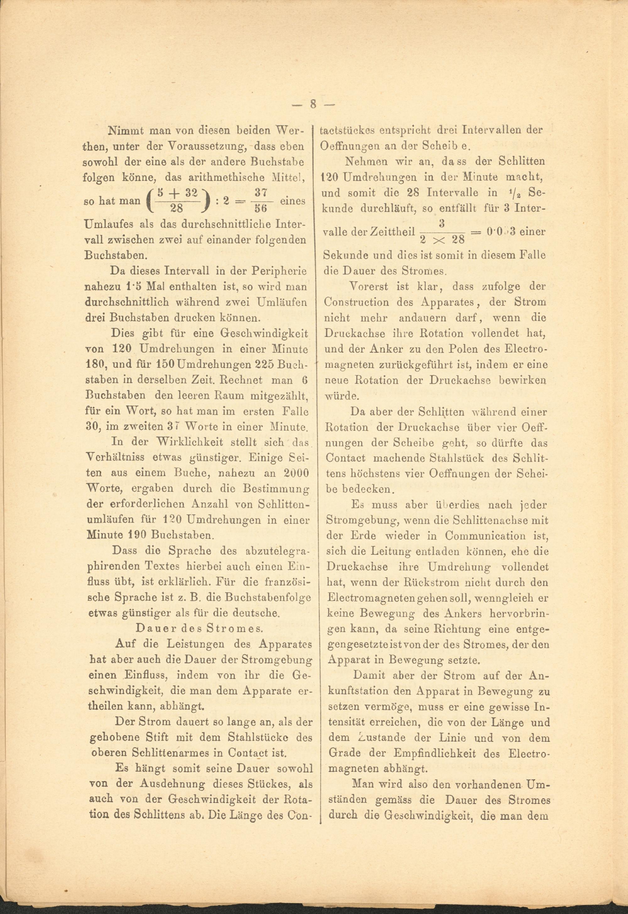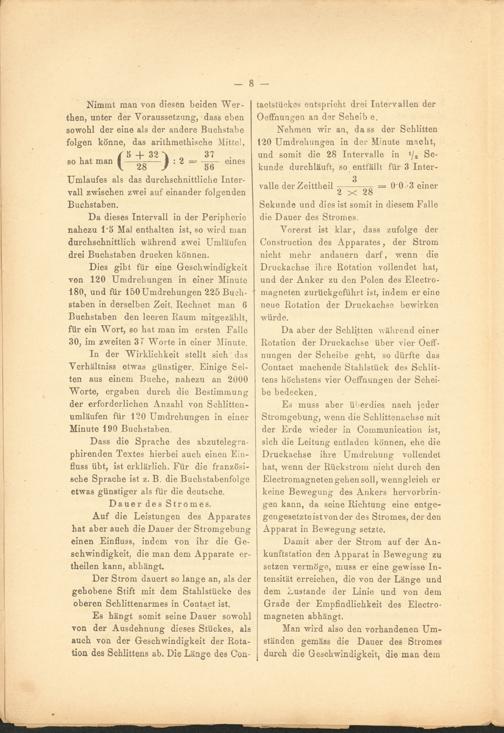 Dies gibt für eine Geschwindigkeit von 120 Umdrehungen in einer Minute 180, und für 150 Umdrehungen 225 Buchstaben in derselben Zeit. Rechnet man 6 Buchstaben den leeren Raum mitgezählt, für ein Wort, so hat man im ersten Falle 30, im zweiten 3T Worte in einer Minute.