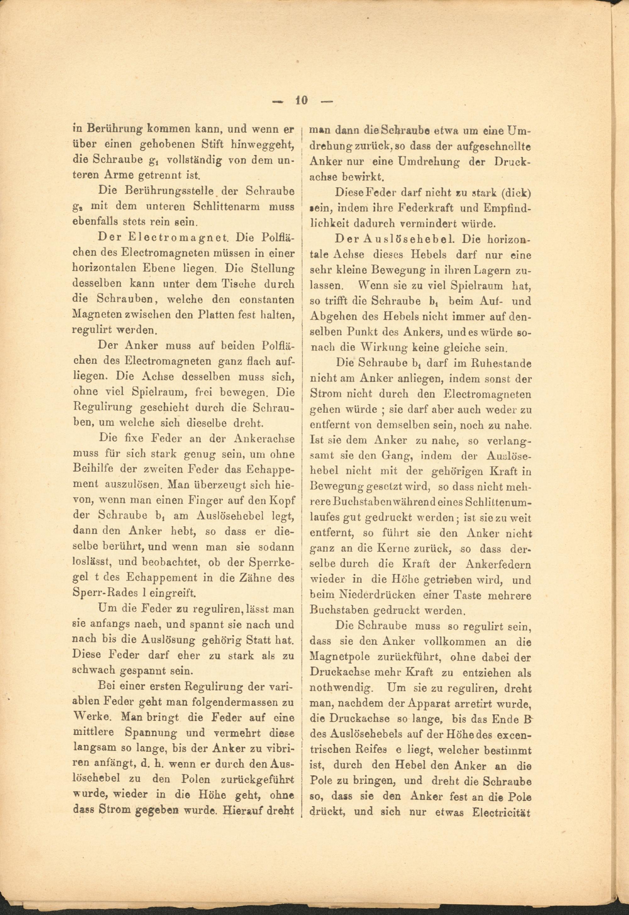 Der Anker muss auf beiden Polflächen des Electromagneten ganz flach aufliegen. Die Achse desselben muss sich, ohne viel Spielraum, frei bewegen. Die Regulirung geschieht durch die Schrauben, um welche sich dieselbe dreht.