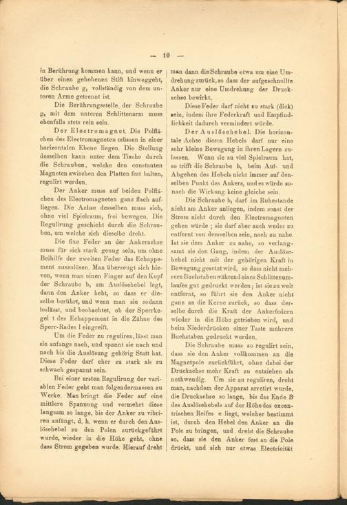 Die Schraube b, darf im Ruhestande nicht am Anker anliegen, indem sonst der Strom nicht durch den Electromagneten gehen würde * sie darf aber auch weder zu entfernt von demselben sein, noch zu nahe. Ist sie dem Anker zu nahe, so verlangsamt sie den Gang, indem der Auslöse- hebel nicht mit der gehörigen Kraft in Bewegung gesetzt wird, so dass nicht mehrere Buchstaben währen deines Schlittenumlaufes gut gedruckt werden j ist sie zu weit entfernt, so führt sie den Anker nicht ganz an die Kerne zurück, so dass derselbe durch die Kraft der Ankerfedern wieder in die Höhe getrieben wird, und beim Niederdrücken einer Taste mehrere Buchstaben gedruckt werden.