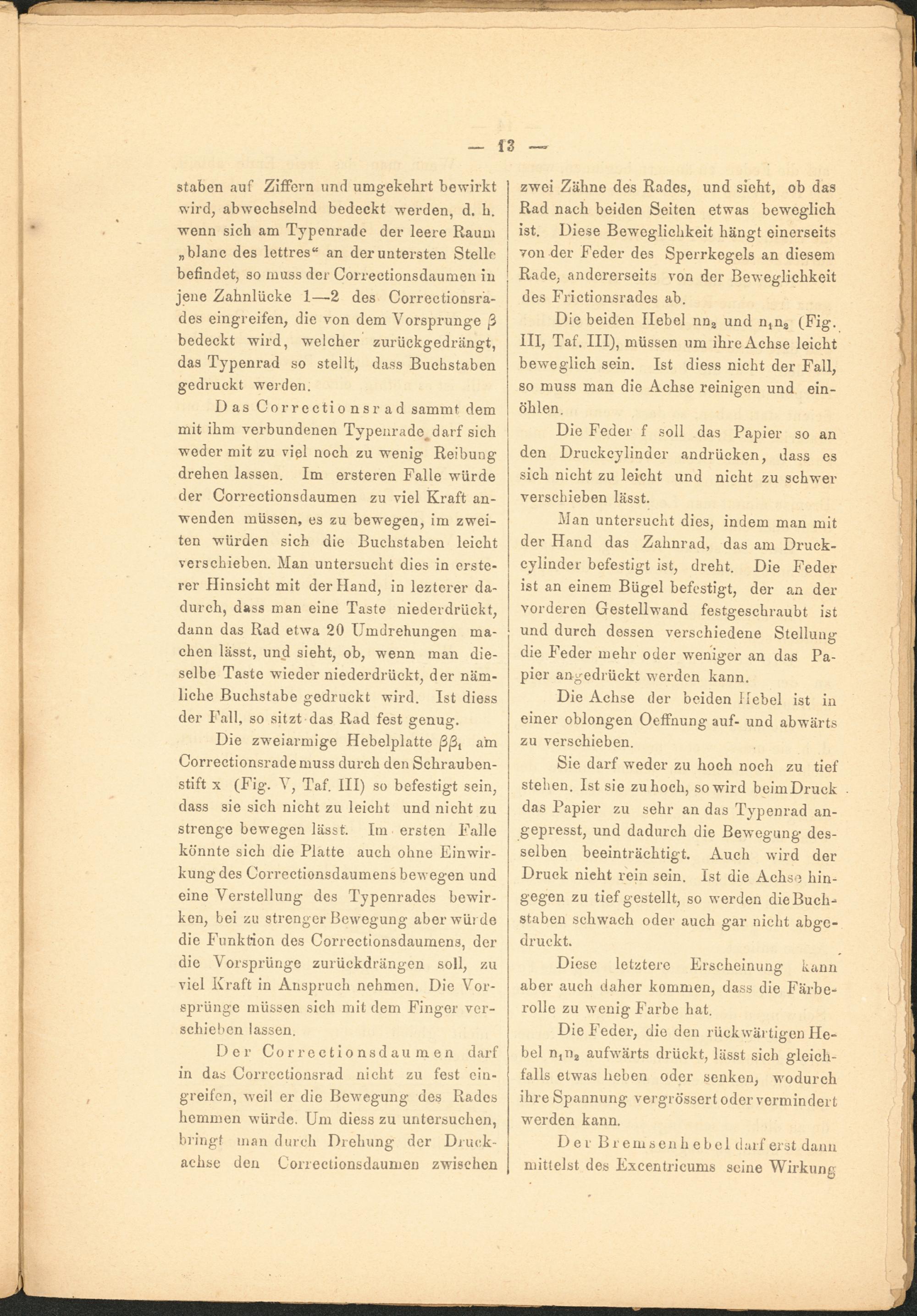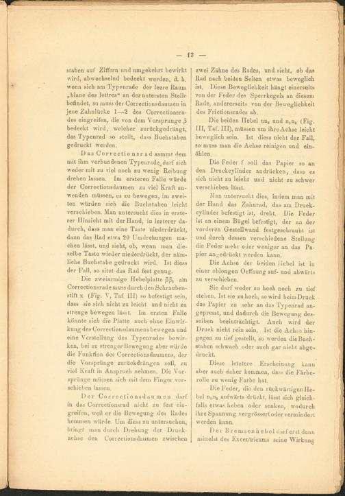 Die zweiarmige Hebelplatte ßß t am Correctionsrademuss durch den Schraubenstift x (Fig. V, Taf. III) so befestigt sein, dass sie sich nicht zu leicht und nicht zu strenge bewegen lässt. Im ersten Falle könnte sich die Platte auch ohne Einwirkung des Correctionsdaumens bewegen und eine Verstellung des Typenrades bewirken, bei zu strenger Bewegung aber würde die Funktion des Correctionsdaumens, der die Vorsprünge zurückdrängen soll, zu viel Kraft in Anspruch nehmen. Die Vorsprünge müssen sich mit dem Finger verschieben lassen.