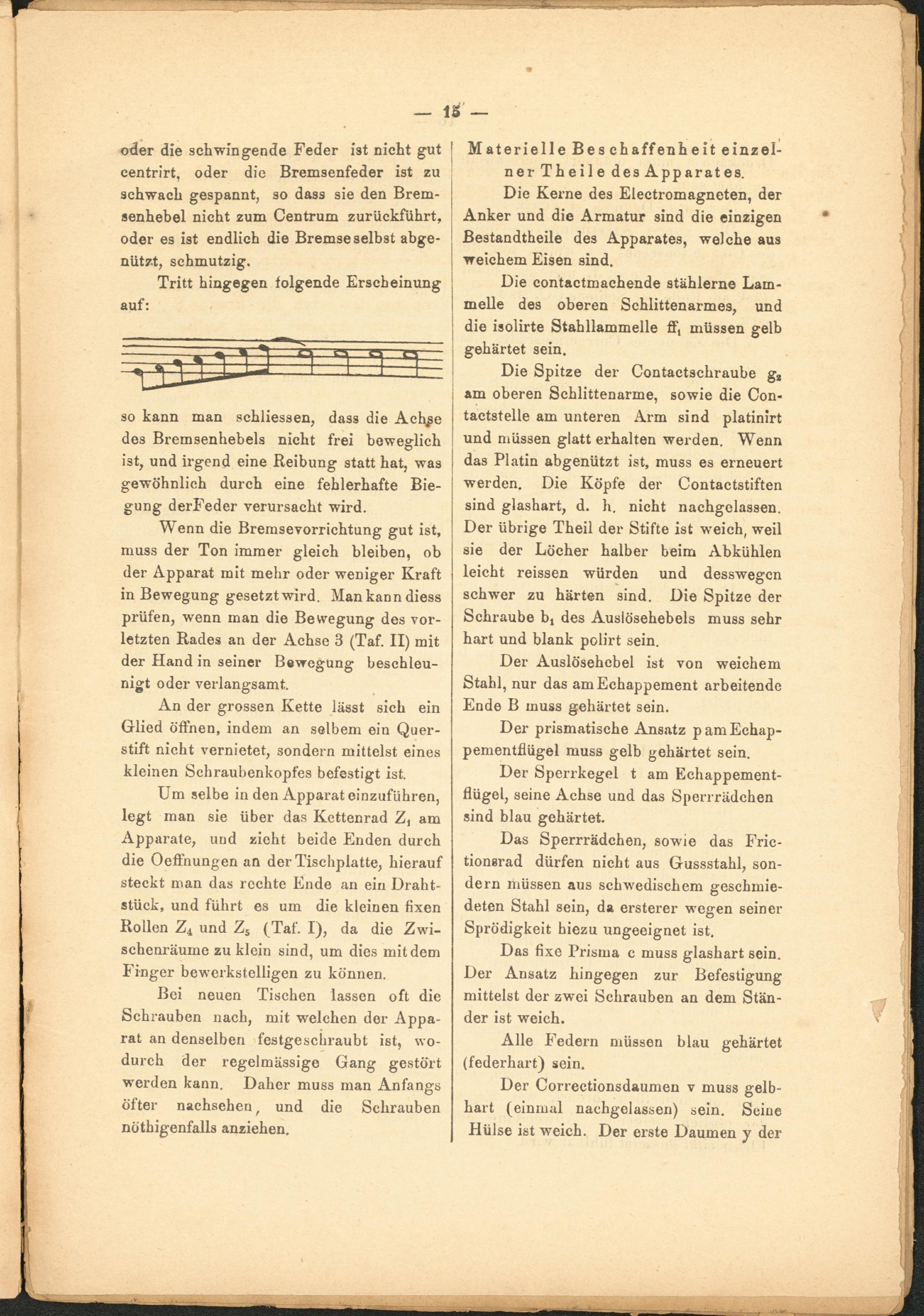 Wenn die Bremsevorrichtung gut ist, muss der Ton immer gleich bleiben, ob der Apparat mit mehr oder weniger Kraft in Bewegung gesetztwird. Mankanndiess prüfen, wenn man die Bewegung des vorletzten Rades an der Achse 3 (Taf. II) mit der Hand in seiner Bewegung beschleunigt oder verlangsamt.
