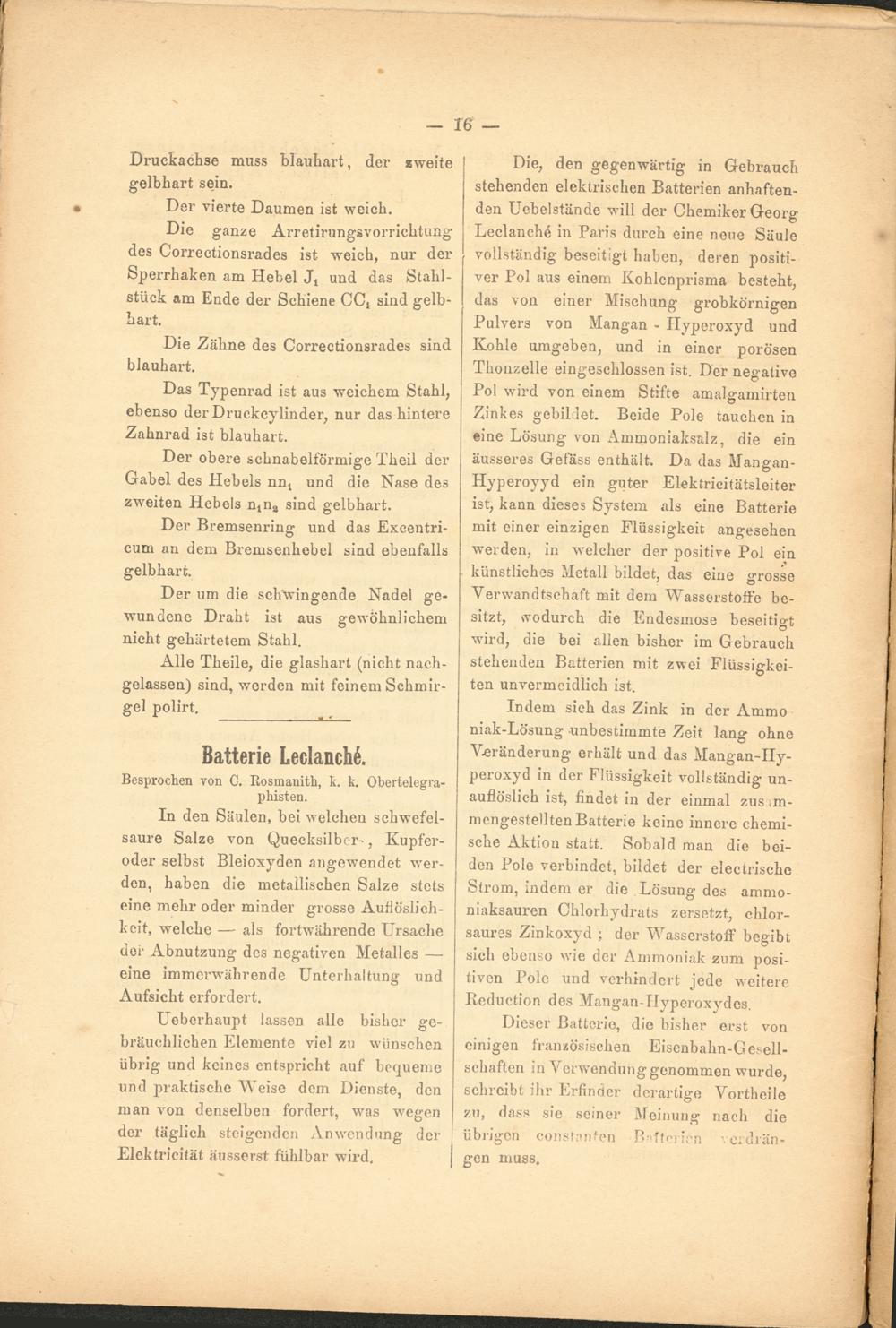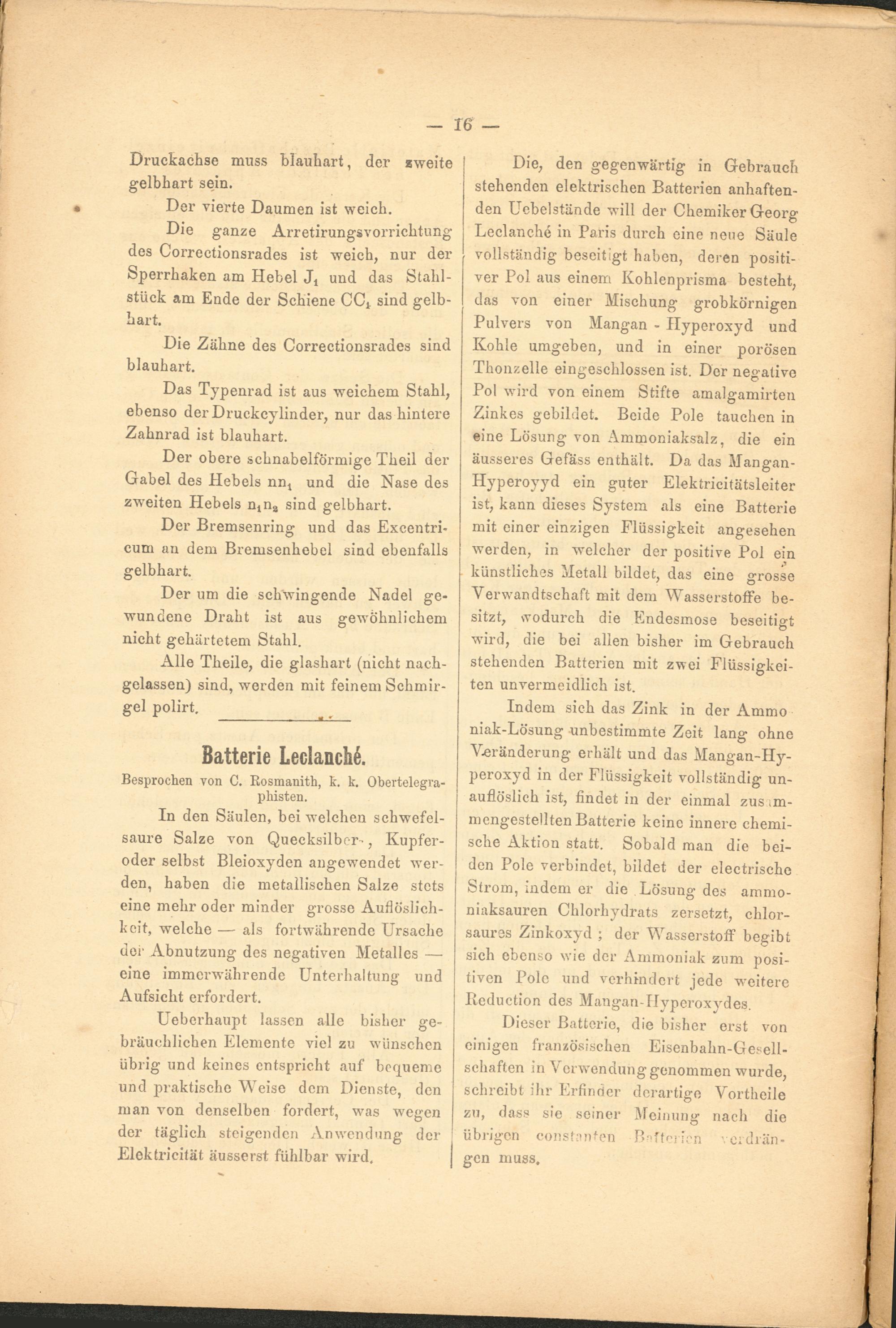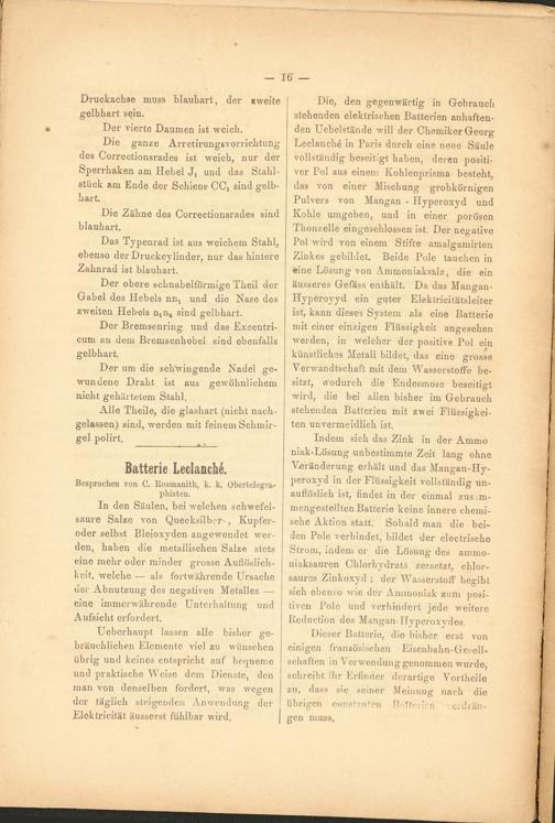 Die, den gegenwärtig in Gebrauch stehenden elektrischen Batterien anhaftenden Uebelstände will der Chemiker Georg Leclanche in Paris durch eine neue Säule vollständig beseitigt haben, deren positiver Pol aus einem Kohlenprisma besteht, das von einer Mischung grobkörnigen Pulvers von Mangan - Hyperoxyd und Kohle umgeben, und in einer porösen Thonzelle eingeschlossen ist. Der negative Pol wird von einem Stifte amalgamirten Zinkes gebildet. Beide Pole tauchen in eine Lösung von Ammoniaksalz, die ein äusseres Gefäss enthält. Da das Mangan- Hyperoyyd ein guter Elektricitätsleiter ist, kann dieses System als eine Batterie mit einer einzigen Flüssigkeit angesehen werden, in welcher der positive Pol ein künstliches Metall bildet, das eine grosse Verwandtschaft mit dem Wasserstoffe besitzt, wodurch die Endesmose beseitigt wird, die bei allen bisher im Gebrauch stehenden Batterien mit zwei Flüssigkeiten unvermeidlich ist.