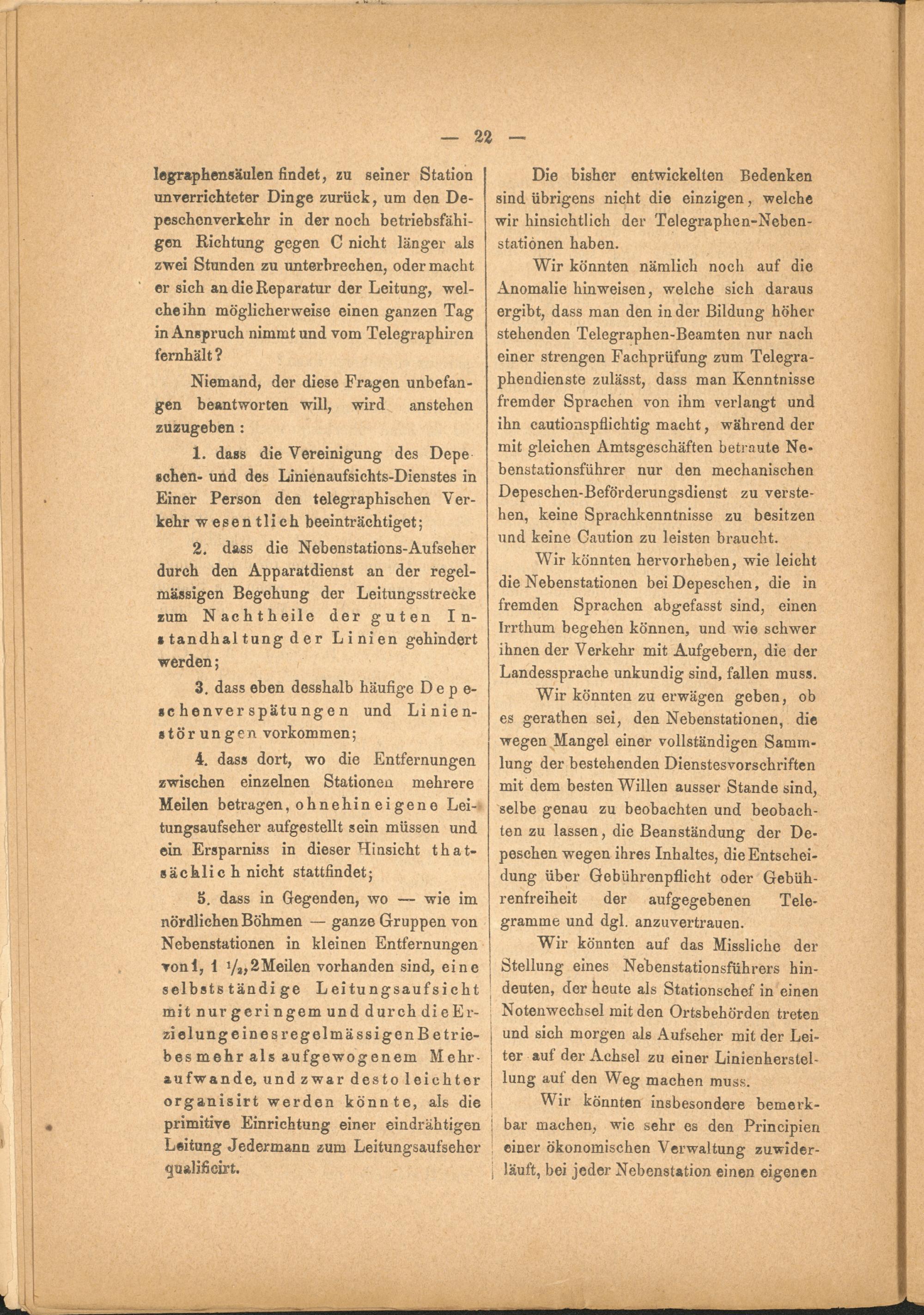 4. dass dort, wo die Entfernungen zwischen einzelnen Stationen mehrere Meilen betragen, ohnehin eigene Leitungsaufseher aufgestellt sein müssen und ein Ersparniss in dieser Hinsicht that- sächlic h nicht stattfindet;