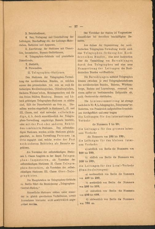 Aus Anlass der Organisirung der norddeutschen Telegraphen-Verwaltung wurde auch eine Telegraphen-Ordnung des Norddeutschen Bundes, eine neue Instruction über die Vermittlung von Barzahlungen durch den Telegraphen und eine neue Nummerirung der Leitungen des Norddeutschen Bundes veröffentlicht.