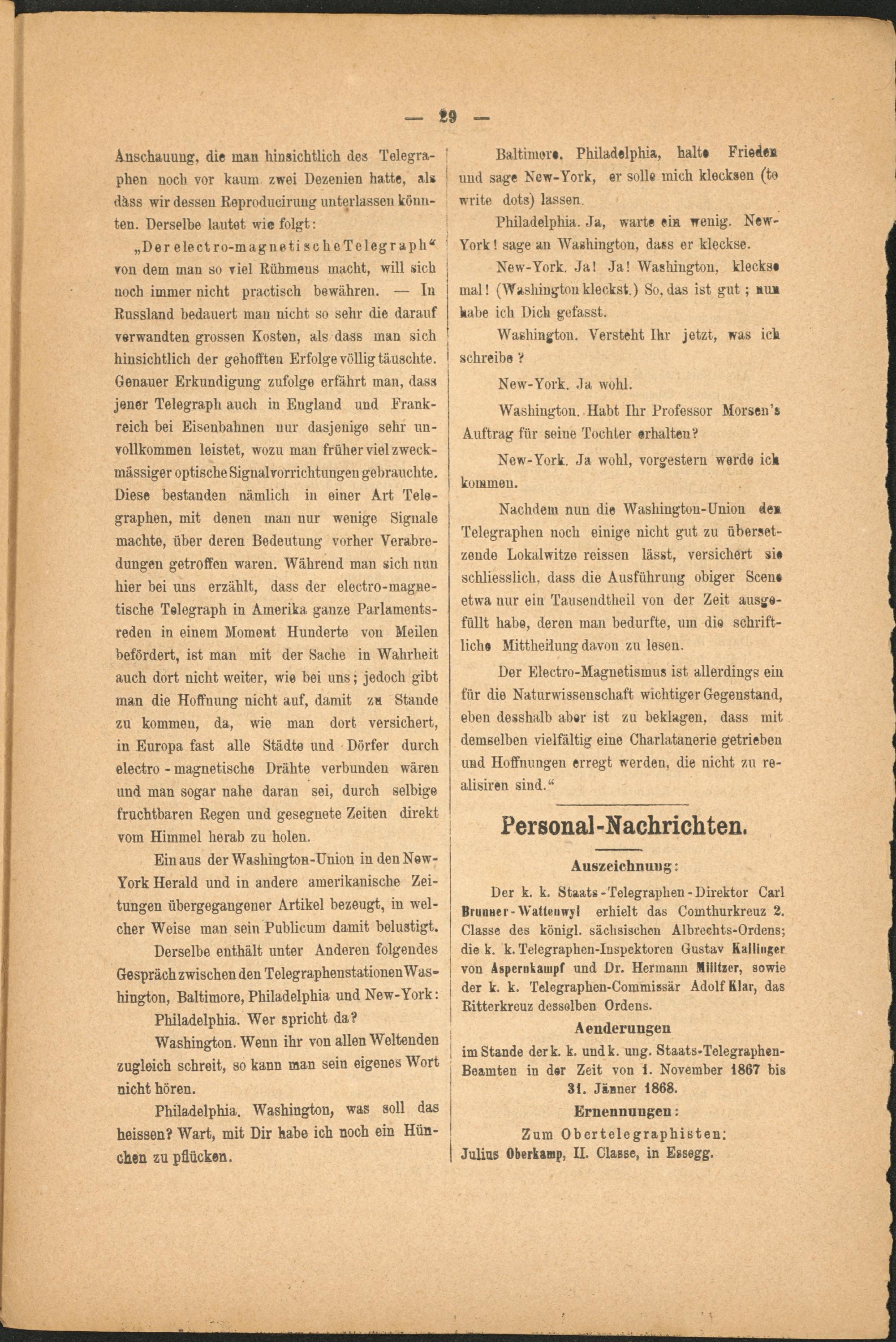 Derselbe enthält unter Anderen folgendes Gespräch zwischen den TelegraphenstationenWas- hington, Baltimore, Philadelphia und New-York: