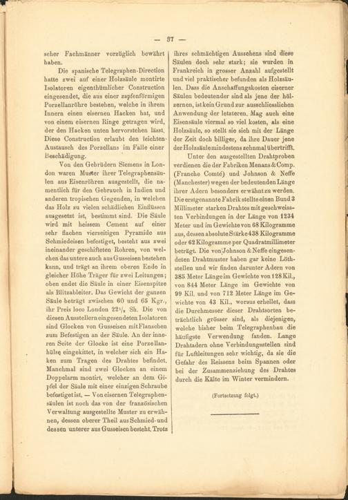 Von den Gebrüdern Siemens in London waren Muster ihrer Telegraphensäulen aus Eisenröhren ausgestellt, die namentlich für den Gebrauch in Indien und anderen tropischen Gegenden, in welchen das Holz zu vielen schädlichen Einflüssen ausgesetzt ist, bestimmt sind. Die Säule wird mit heissem Cement auf einer sehr flachen vierseitigen Pyramide aus Schmiedeisen befestiget, besteht aus zwei ineinander geschifteten Rohren, von welchen das untere auch aus Gusseisen bestehen kann, und trägt an ihrem oberen Ende in gleicher Höhe Träger für zwei Leitungen; oben endet die Säule in einer Eisenspitze als Blitzableiter. Das Gewicht der ganzen Säule beträgt zwischen 60 und 65 Kgr., ihr Preis loco London 22 1 / 8 Sh. Die von diesen Ausstellern eingesendeten Isolatoren sind Glocken von Gusseisen mitFlanschen zum Befestigen an der Säule. An der inneren Seite der Glocke ist eine Porzellan- hülsQ eingekittet, in welcher sich ein Haken zum Tragen des Drahtes befindet. Manchmal sind zwei Glocken an einem Doppelarm montirt, welcher an dem Gipfel der Säule mit einer einzigen Schraube befestiget ist. — Von eisernen Telegraphensäulen ist noch das von der französischen Verwaltung ausgestellte Muster zu erwähnen, dessen oberer Theil aus Schmied-und dessen unterer aus Gusseisen besteht. Trotz