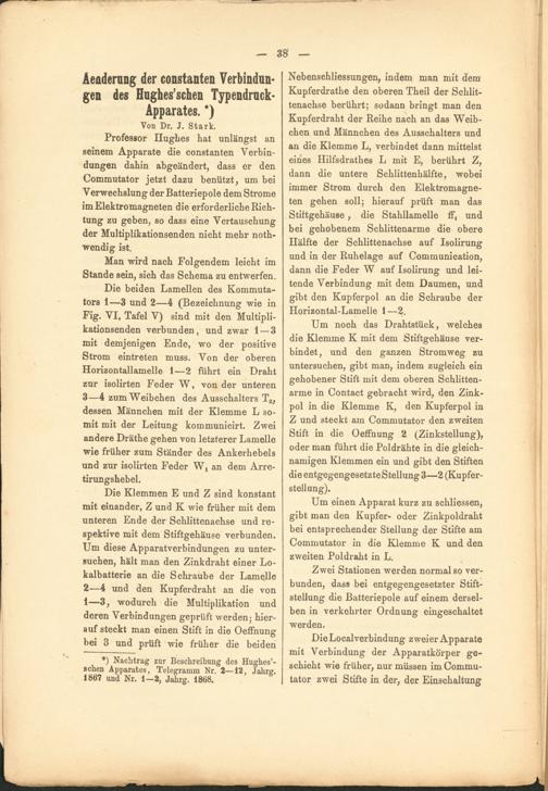 *) Nachtrag zur Beschreibung des Hughes’schen Apparates, Telegramm Nr. 2—12, Jahrg. 1867 und Nr. 1—2, Jahrg. 1868.