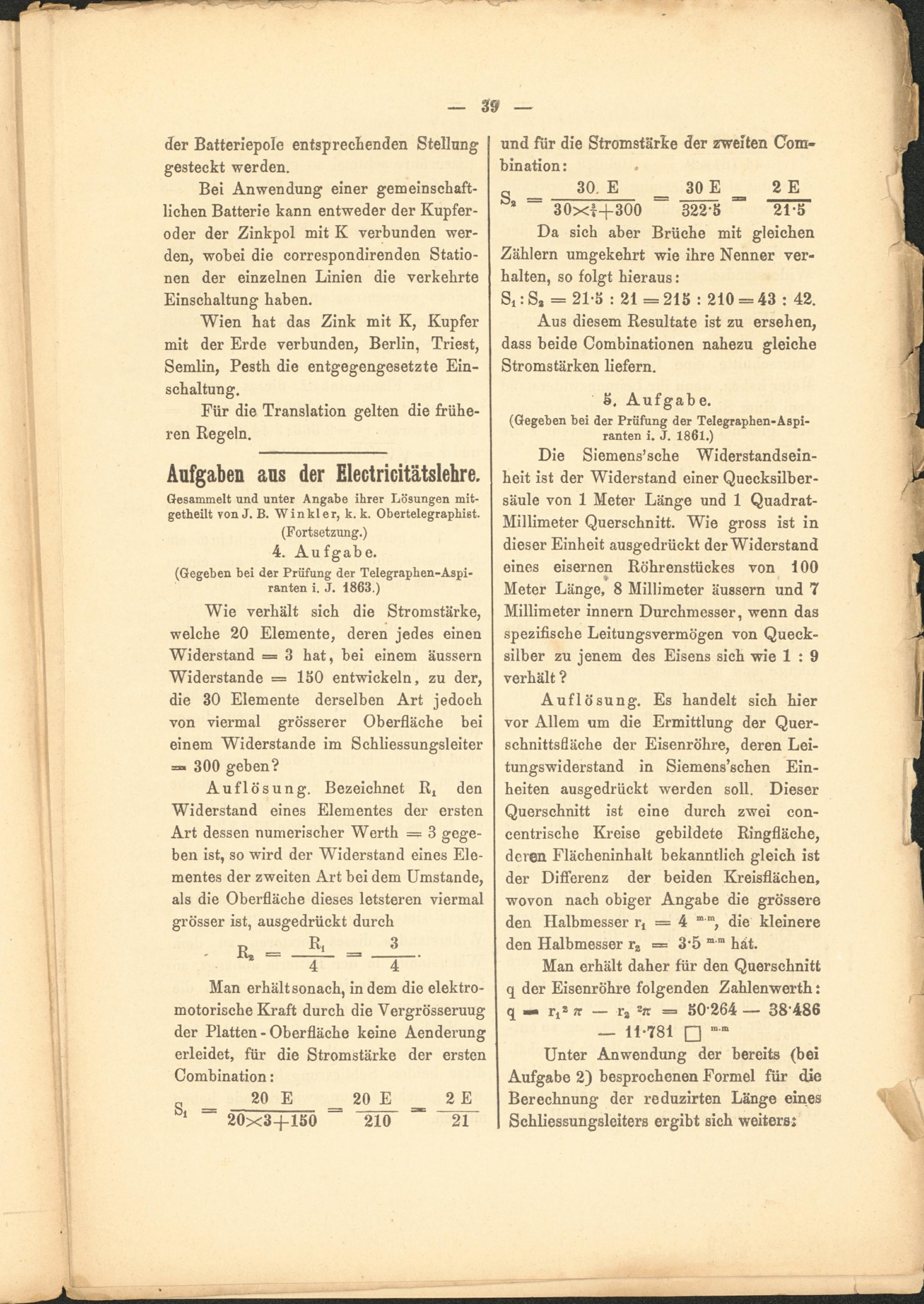 Gesammelt und unter Angabe ihrer Lösungen mit- getheilt von J. B. Winkler, k. k. Obertelegraphist.