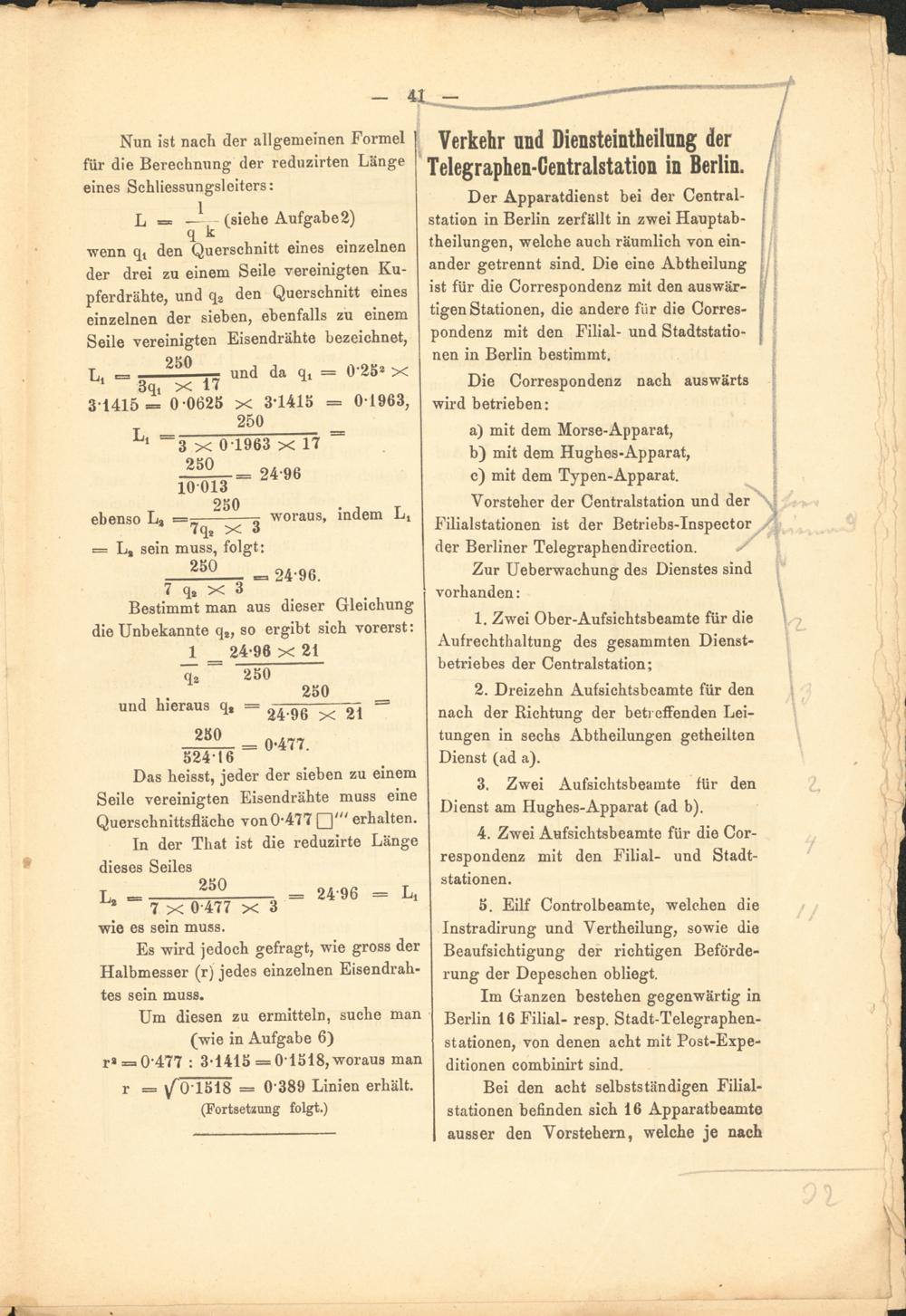 Der Apparatdienst bei der Centralstation in Berlin zerfällt in zwei Hauptabtheilungen, welche auch räumlich von einander getrennt sind. Die eine Abtheilung ist für die Correspondenz mit den auswärtigen Stationen, die andere für die Correspondenz mit den Filial- und Stadtstationen in Berlin bestimmt.