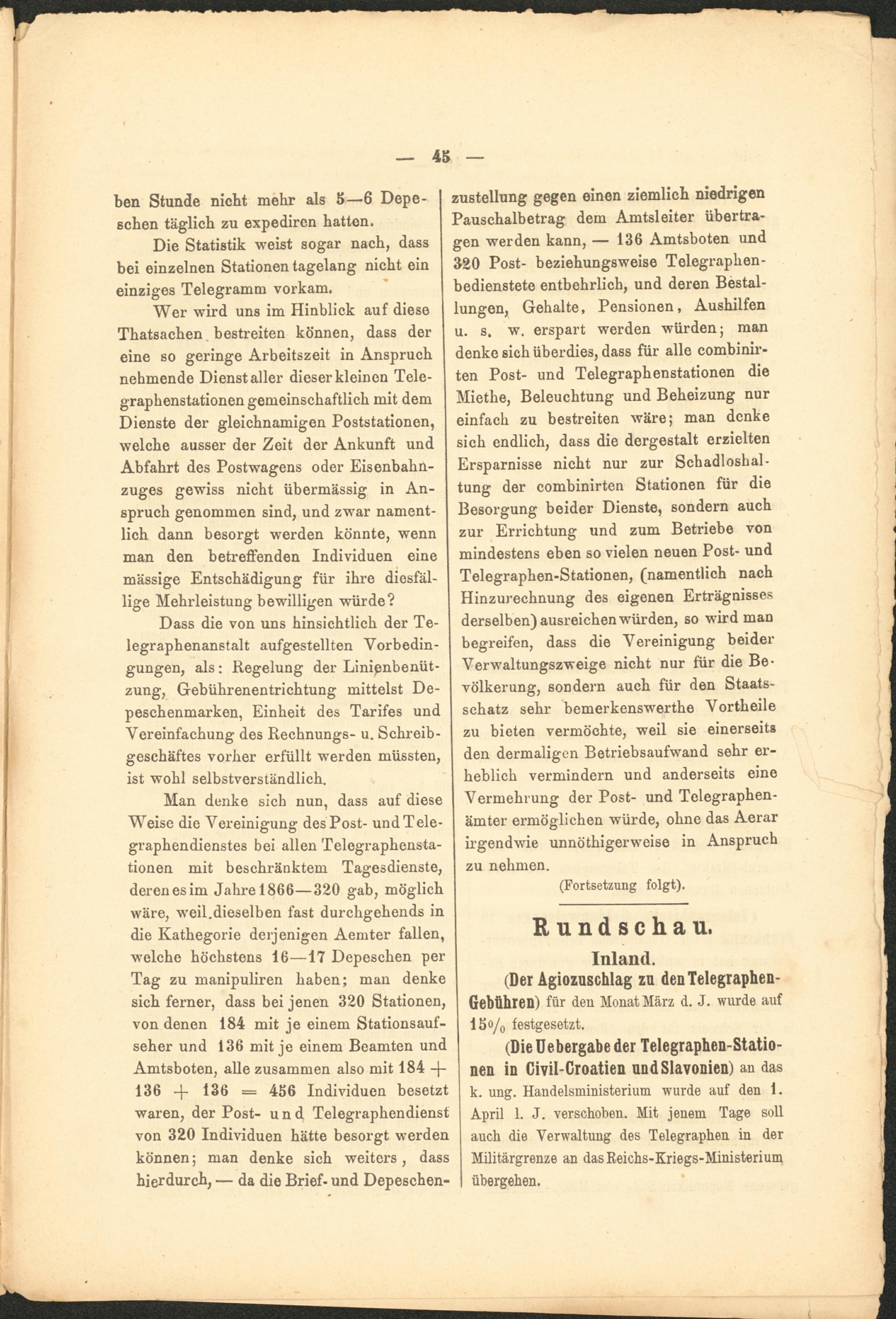 (Die Uebergabe der Telegraphen-Stationen in Givil-Croatien undSlavonien) an das