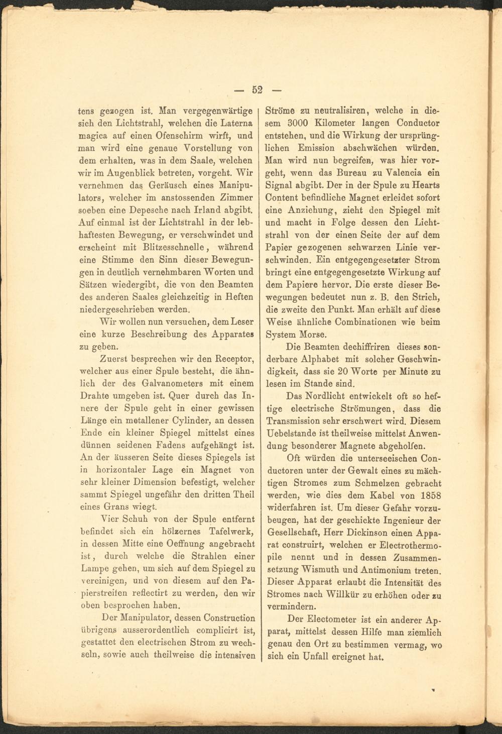 Oft würden die unterseeischen Con- ductoren unter der Gewalt eines zu mächtigen Stromes zum Schmelzen gebracht werden, wie dies dem Kabel von 1858 widerfahren ist. Um dieser Gefahr vorzubeugen, hat der geschickte Ingenieur der Gesellschaft, Herr Dickinson einen Apparat construirt, welchen er Electrothermo- pile nennt und in dessen Zusammensetzung Wismuth und Antimonium treten. Dieser Apparat erlaubt die Intensität des Stromes nach Willkür zu erhöhen oder zu vermindern.