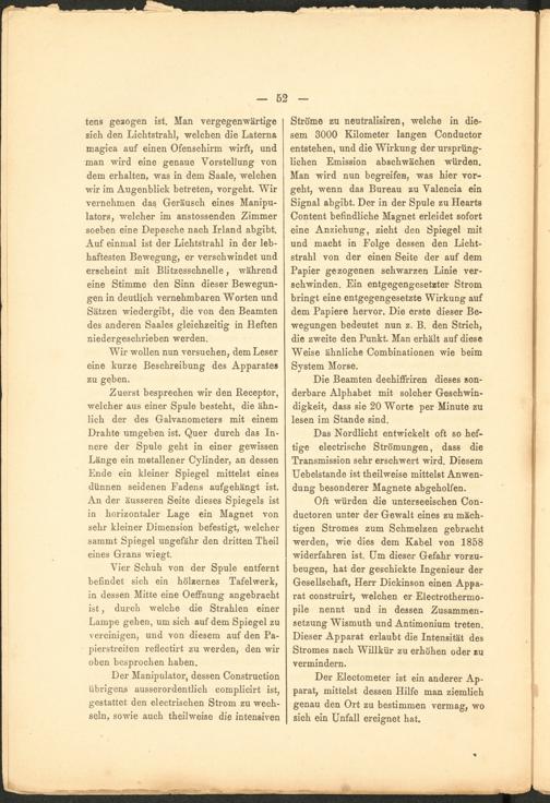 tens gezogen ist. Man vergegenwärtige sich den Lichtstrahl, welchen die Laterna magica auf einen Ofenschirm wirft, und man wird eine genaue Vorstellung von dem erhalten, was in dem Saale, welchen wir im Augenblick betreten, vorgeht. Wir vernehmen das Geräusch eines Manipulators, welcher im anstossenden Zimmer soeben eine Depesche nach Irland abgibt. Auf einmal ist der Lichtstrahl in der lebhaftesten Bewegung, er verschwindet und erscheint mit Blitzesschnelle, während eine Stimme den Sinn dieser Bewegungen in deutlich vernehmbaren Worten und Sätzen wiedergibt, die von den Beamten des anderen Saales gleichzeitig in Heften niedergeschrieben werden.