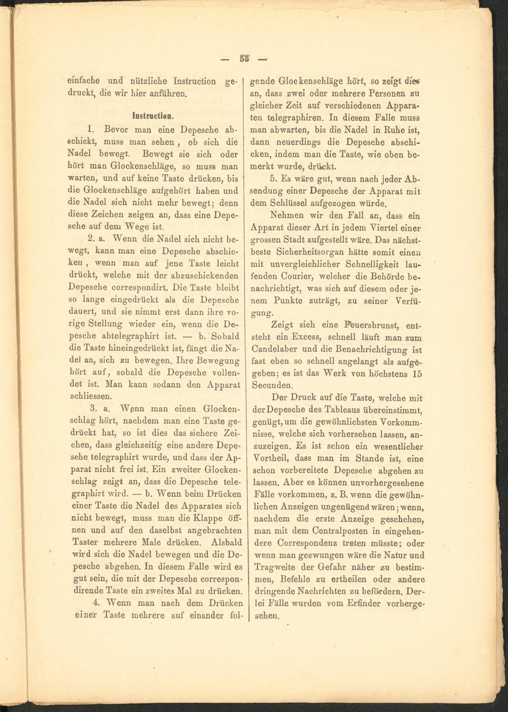 gende Glockenschläge hört, so zeigt die* an, dass zwei oder mehrere Personen zu gleicher Zeit auf verschiedenen Apparaten telegraphiren. In diesem Falle muss man abwarten, bis die Nadel in Ruhe ist, dann neuerdings die Depesche abschicken, indem man die Taste, wie oben bemerkt wurde, drückt.