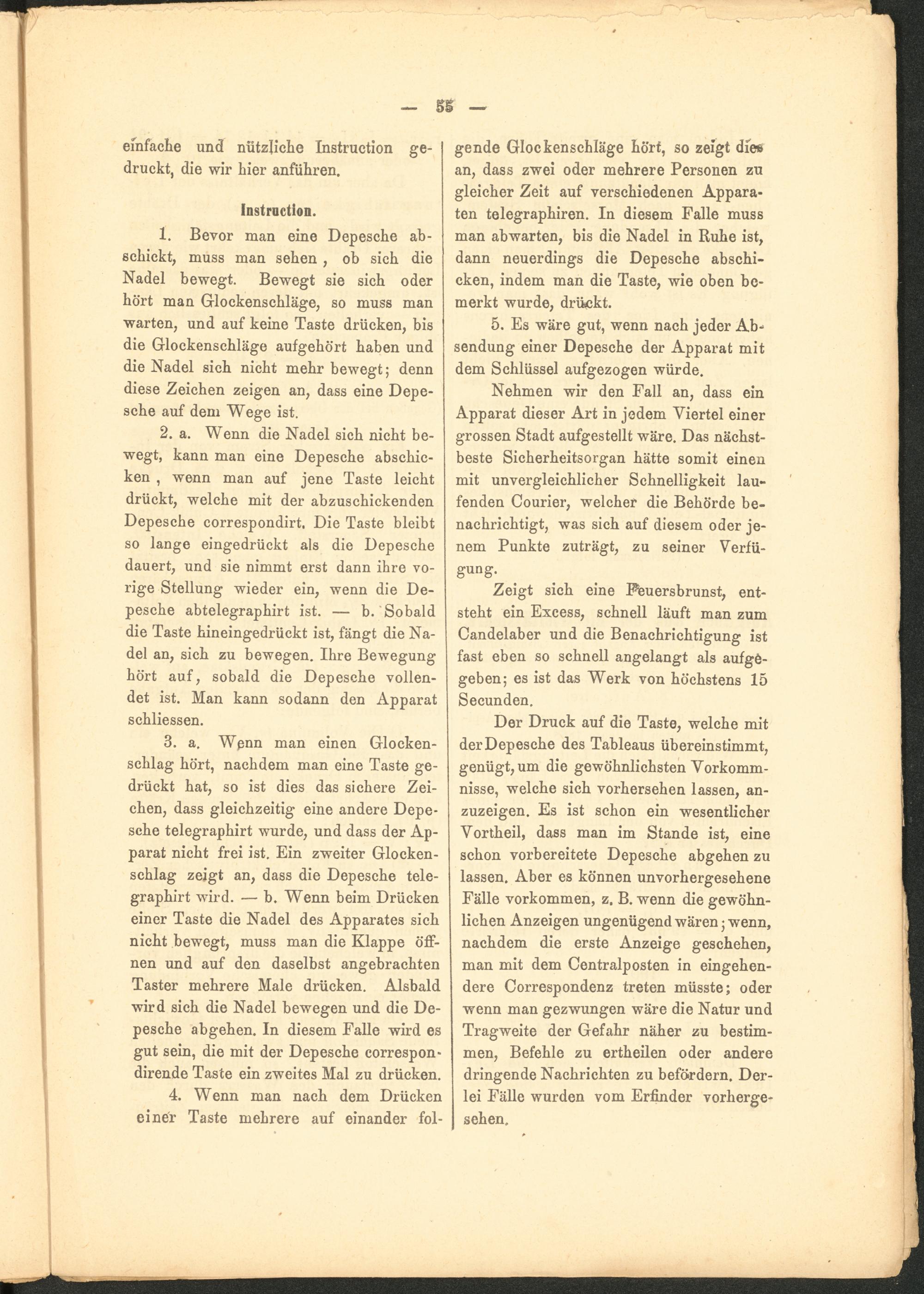 1. Bevor man eine Depesche ab- schickt, muss man sehen , ob sich die Nadel bewegt. Bewegt sie sich oder hört man Glockenschläge, so muss man warten, und auf keine Taste drücken, bis die Glockenschläge aufgehört haben und die Nadel sich nicht mehr bewegt; denn diese Zeichen zeigen an, dass eine Depesche auf dem Wege ist.
