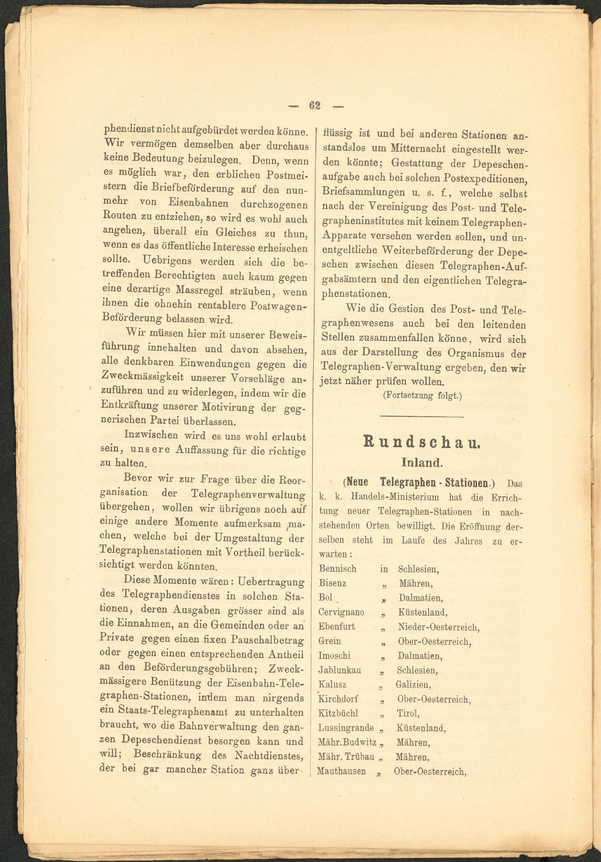 k. k. Handels-Ministerium hat die Errichtung neuer Telegraphen-Stationen in nachstehenden Orten bewilligt. Die Eröffnung derselben steht im Laufe des Jahres zu erwarten :