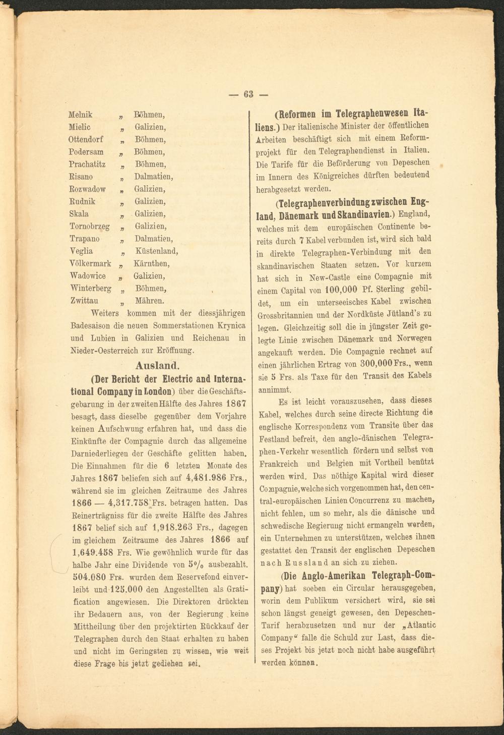 (Der Bericht der Electric and international Company in London) über die Geschäftsgebarung in der zweitenHälfte des Jahres 1867 besagt, dass dieselbe gegenüber dem Vorjahre keinen Aufschwung erfahren hat, und dass die Einkünfte der Compagnie durch das allgemeine Darniederliegen der Geschäfte gelitten haben. Die Einnahmen für die 6 letzten Monate des Jahres 1867 beliefen sich auf 4,481.986 Frs., während sie im gleichen Zeiträume des Jahres