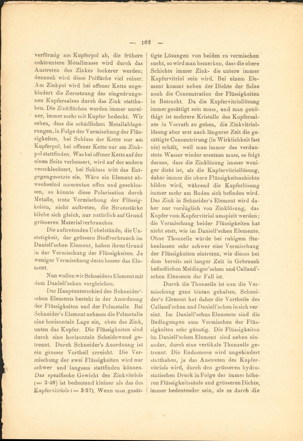 tigte Lösungen von beiden zu vermischen sucht, so wird man bemerken, dass die obere Schichte immer Zink- die untere immer Kupfervitriol sein wird. Bei einem Element kommt neben der Dichte der Salze noch die Concentration der Flüssigkeiten in Betracht. Da die Kupfervitriollösung immer gesättigt sein muss, und man genö- thigt ist mehrere Kristalle des Kupfersalzes in Vorrath zu geben, die Zinkvitriol- lösung aber erst nach längerer Zeit die gesättigte Concentrirung (in Wirklichkeit fast nie) erhält, weil man immer das verdunstete Wasser wieder ersetzen muss, so folgt daraus, dass die Zinklösung immer weniger dicht ist, als die Kupfervitriollösung, daher immer die obere Flüssigkeitsschichte bilden wird, während die Kupferlösung immer mehr am Boden sich befinden wird. Das Zink in Schneider’s Element wird daher nur vorzüglich von Zinklösung, das Kupfer vom Kupfervitriol umspielt werden; die Vermischung beider Flüssigkeiten hat nicht statt, wie im Daniell’schen Elemente. Ohne Thonzelle würde bei ruhigem Stehenlassen sehr schwer eine Vermischung der Flüssigkeiten eintreten, wie dieses bei dem bereits seit langer Zeit in Gebrauch befindlichen Meidinger’schen und Callaud’- schen Elemente der Fall ist.