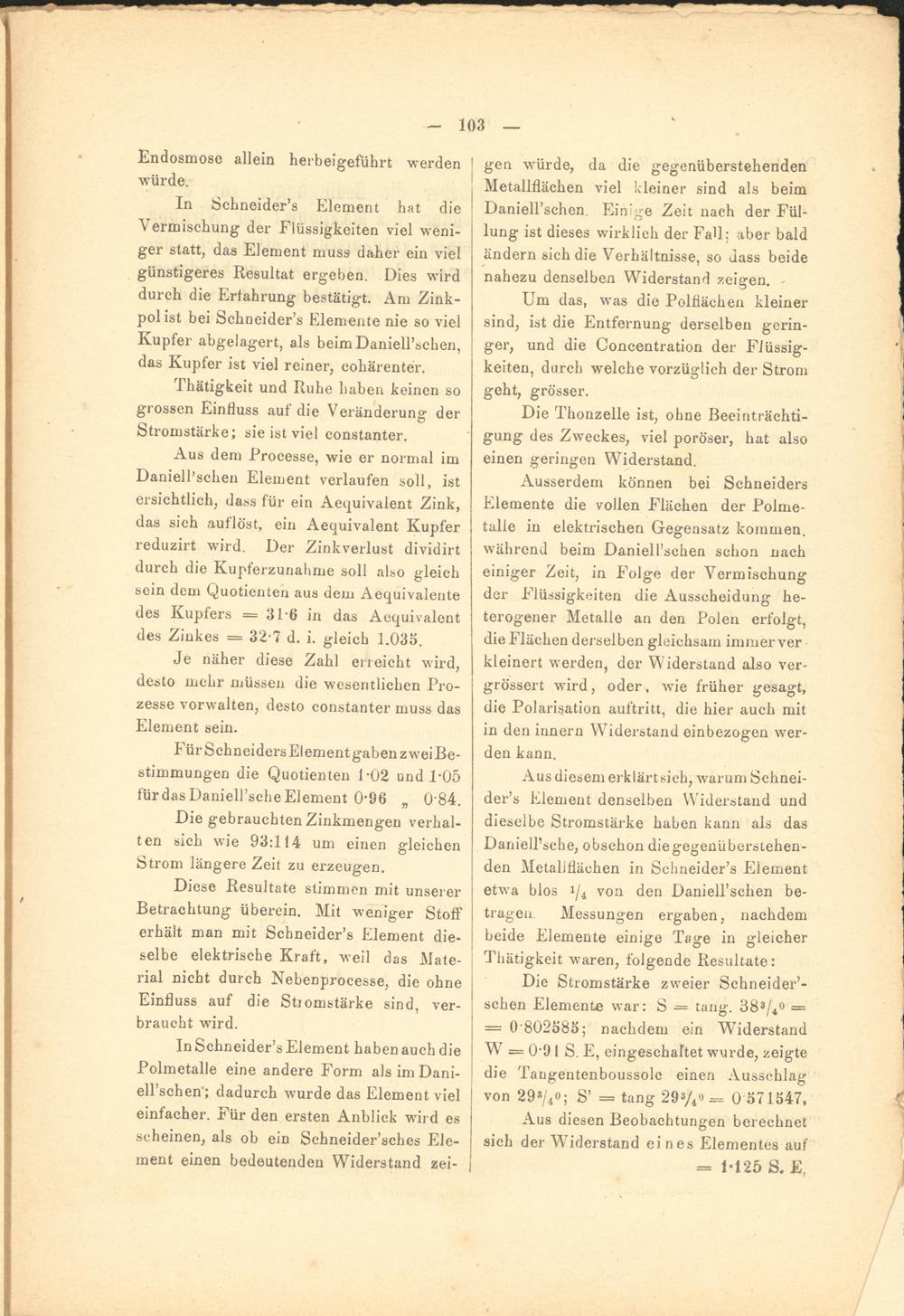 Ausserdem können bei Schneiders Elemente die vollen Flächen der Polmetalle in elektrischen Gegensatz kommen, während beim Daniell’schen schon nach einiger Zeit, in Folge der Vermischung der Flüssigkeiten die Ausscheidung heterogener Metalle an den Polen erfolgt, die Flächen derselben gleichsam immer ver kleinert werden, der Widerstand also ver- grössert wird, oder, wie früher gesagt, die Polarisation auftritt, die hier auch mit in den innern Widerstand einbezogen werden kann.