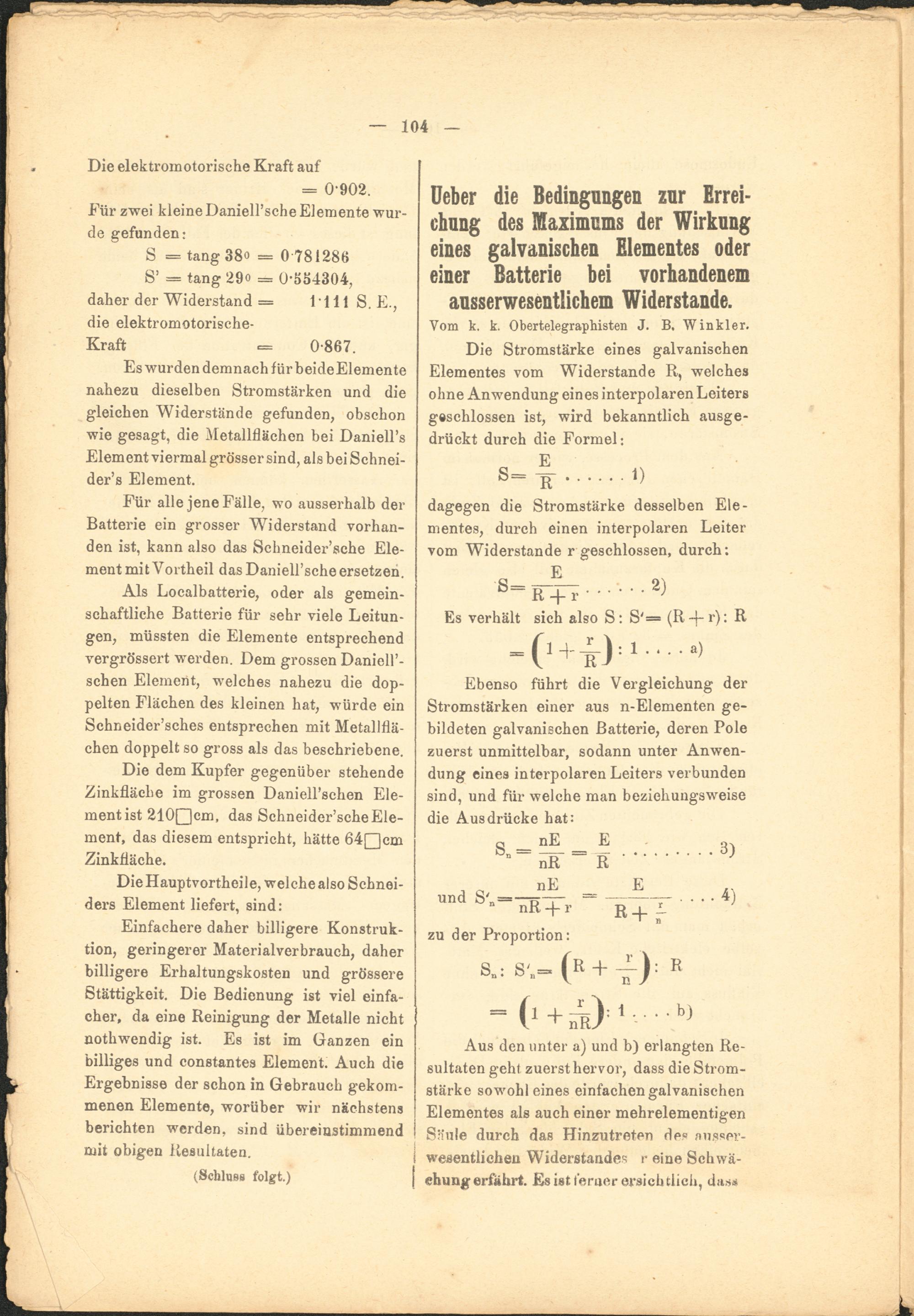 Für alle jene Fälle, wo ausserhalb der Batterie ein grosser Widerstand vorhanden ist, kann also das Schneider’sche Element mit Vortheil das Daniell’sche ersetzen.