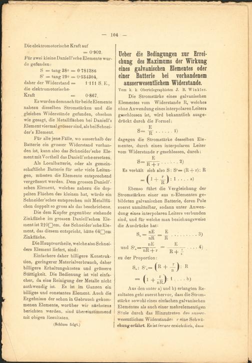 Aus den unter a) und b) erlangten Resultaten geht zuerst hervor, dass die Stromstärke sowohl eines einfachen galvanischen Elementes als auch einer mehrelementigen Säule durch das Hinzutreten des nusser-