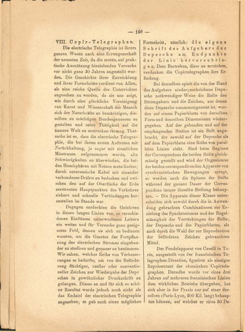 Dagegen entdeckten die Gelehrten in diesen langen Linien von, so verschiedenen Einflüssen unterworfenen Leitern ein weites und für Versuche ganz geeignetes Feld, dessen sie sich zu bedienen wussten, um die Gesetze der Fortpflanzung des electrischen Stromes eingehender zu studiren und genauer zu bestimmen. Wir sahen, welcher Reihe von Verbesserungen es bedurfte, um von der Beförderung flüchtiger, reeller oder conventio- neller Zeichen zur Wiedergabe der Depe sehen in gewöhnlicher Druckschrift zu gelangen. Dieses an und für sich so schöne Resultat wurde jedoch noch nicht als das Endziel der electrischen Telegraphie angesehen; es gab noch einen möglichen