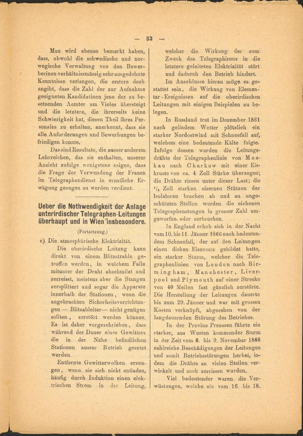 ln England erhob sich in der Nacht vom 10, bis 11. Jänner 1866 nach bedeutendem Schneefall, der auf den Leitungen einen dicken Eisansatz gebildet hatte, ein starker Sturm, welcher die Telegraphenlinien von London nach Bir- mingham, Manchester, Liverpool und Plymouth auf einer Strecke von 40 Meilen fast gänzlich zerstörte. Die Herstellung der Leitungen dauerte bis zum 29. Jänner und war mit grossen Kosten verknüpft, abgesehen von der langdauernden Störung des Betriebes.