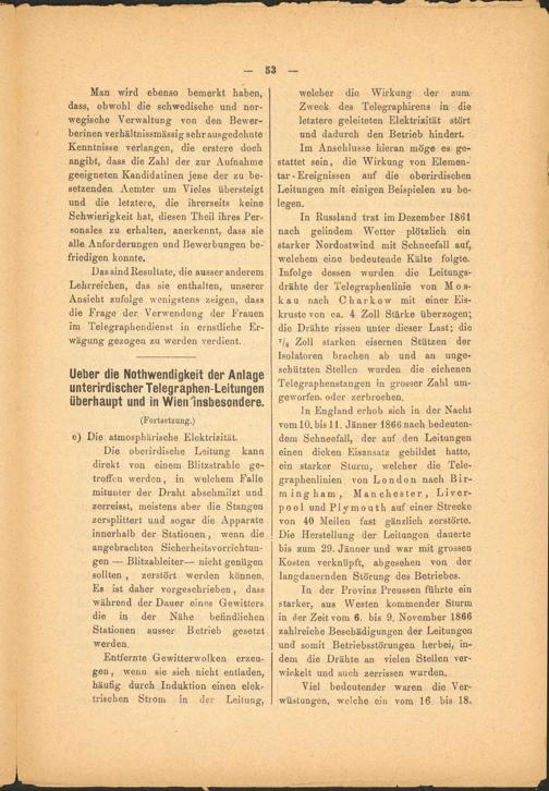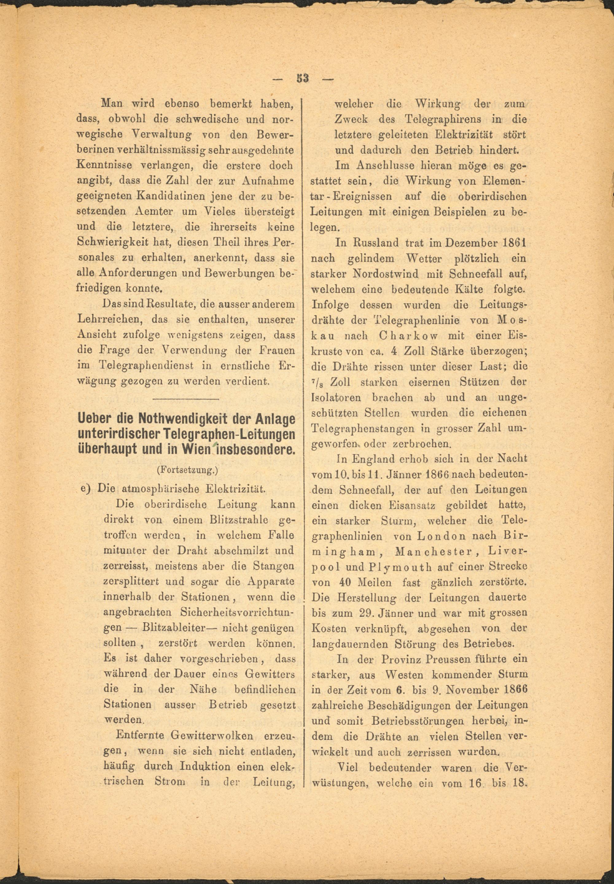 In Russland trat im Dezember 1861 nach gelindem Wetter plötzlich ein starker Nordostwind mit Schneefall auf, welchem eine bedeutende Kälte folgte. Infolge dessen wurden die Leitungsdrähte der Telegraphenlinie von M o s- kau nach Charkow mit einer Eiskruste von ca. 4 Zoll Stärke überzogen; die Drähte rissen unter dieser Last; die 7 / 8 Zoll starken eisernen Stützen der Isolatoren brachen ab und an ungeschützten Stellen wurden die eichenen Telegraphenstangen in grosser Zahl umgeworfen. oder zerbrochen.
