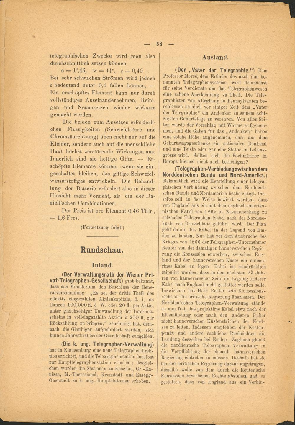 (Telegraphen-Verbindung zwischen dem Norddeutschen Bunde und Nord-Amerika.)